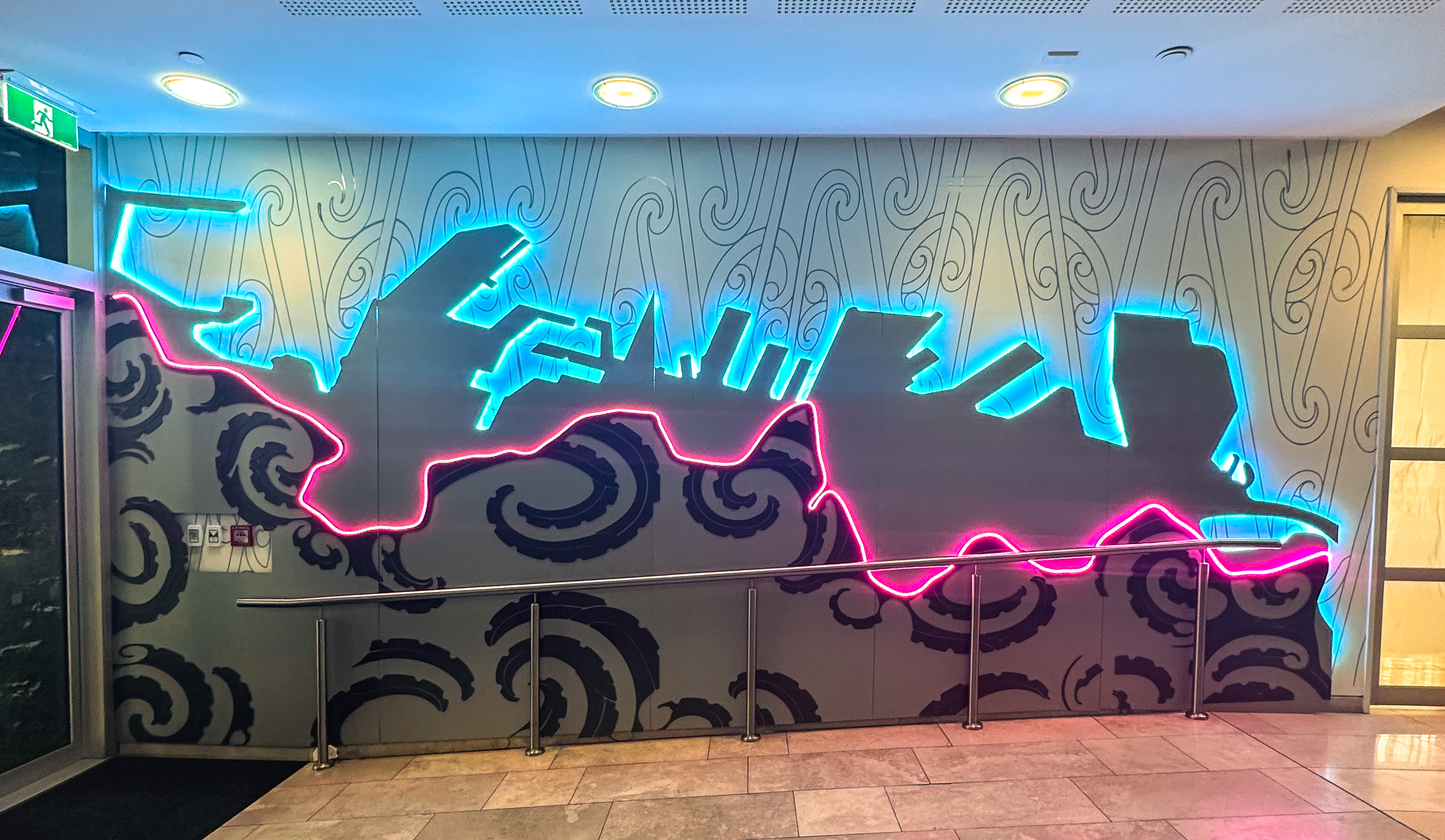 One of his latest pieces, Tai Timu, adorns the entrance to AECOM House in Te Tōangaroa and captures a significant piece of history through its depiction of the original Auckland CBD shoreline (in pink), and the current shoreline (in blue) that we know and see today. The LED lights incorporated in this particular piece allows the opportunity for real time engagement with the tidal activity at Te Tōangaroa which sees a dark blue light at low tide and light blue at high tide.